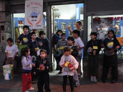 Con instrumentos fabricados con elementos reciclados, los chicos que participan de los talleres de la Asociación El Trapito realizaron una ruidosa batucada en la esquina de Olavarría y Palos el 5 de mayo de 2011. Pidieron por la paz, por el fin de la violencia y la prohibición de las armas de fuego.